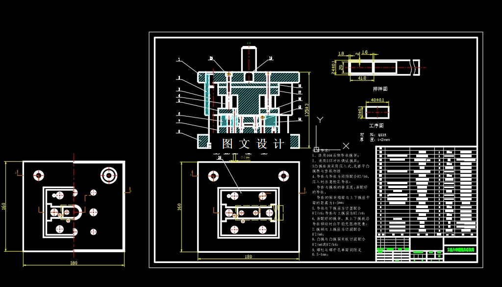 该设计的冲裁件 是一种方型垫片,材料为Q235钢,料厚t=2mm,该冲裁件结构简单,比较适合冲裁。技术要求,该零件尺寸图上所有未标注公差为IT14级确定工件尺寸公差,属于自由尺寸,设计的主要工序就是落料,设计的是单工序模具,有三维模型 二维装配图 凹凸模零件图 文字说明讲解 欢迎大家学习