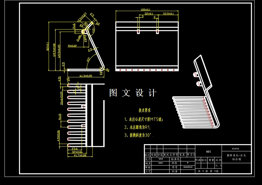 本次设计的生活类型的模具,主要是生活中常用的发夹类,也直接可以接触的东西, 用的是ABS材料,采用的大水口侧进胶,一模两腔,模具结构合理,四大系统均有,才有侧抽芯结构。设计内容包括三维,二维 尺寸计算 及设计全部内容,欢迎大家下载学习