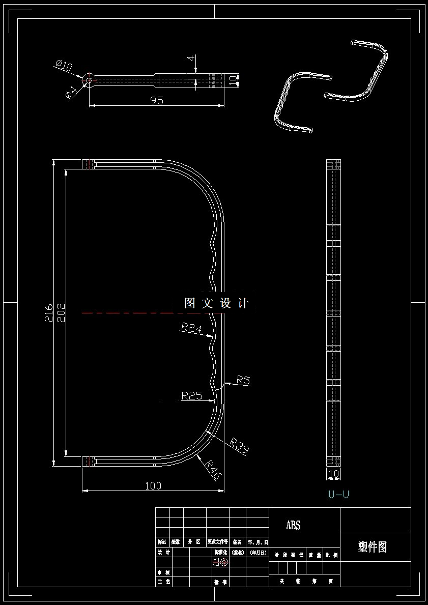 公共汽车安全扶手塑件的注塑模具设计。通过对制件的分析以及计算,模具选择一模一腔的布局,进行了分型面选取,选择注塑机型号及校核,选择合适的浇注系统及模具成型部分设计计算,结合查阅计算的数据,用CAD绘制出二维模具图纸编辑,在选定分型面时尽量选定在该塑件端面的最大处,同时要考虑脱模时会不会卡模等问题。随后对该塑件进行型腔布局,根据塑件的外形尺寸等因素查表得在本次设计中采用的是一模一腔的型腔布局方式,在进行型芯型腔的设计时,各个地方的壁厚均要达到标准厚度,保证型芯型腔的使用寿命。根据该塑件的尺寸大小及体积选用侧浇口浇筑系统和合理的流道尺寸,以保证能够一次打满产品。随后设计模具的定出机构和冷却系统,在设计定出机构时要保证产品脱模受力均匀,冷却水道的设计要符合实际。最后综合各个系统的设计数据进行查表比对选用合适的注塑机。进行注塑机参数校核。最后绘制二维工程图纸,装订图册。