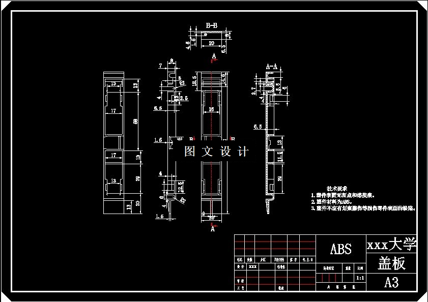 本设计为注塑模的设计,设计分型面选在截面最大处,塑件成型后利用推杆将成型制品从动模上推出,回程时利用复位杆复位。 设计中需要对塑件的尺寸进行计算,确定尺寸精度,然后进行注射机的选取。对注射机参数进行校核,包括模具闭合厚度、模具安装尺寸、模具开模行程、注射机的锁模力等。各个参数都满足要求后才能确定注射机的型号。 在设计过程中,为了更清楚的表达模具的内部结构,因此附有大量的模具结构图和模具局部图,并通过通过CAD和三维软件画出它的二维、三维立体图。