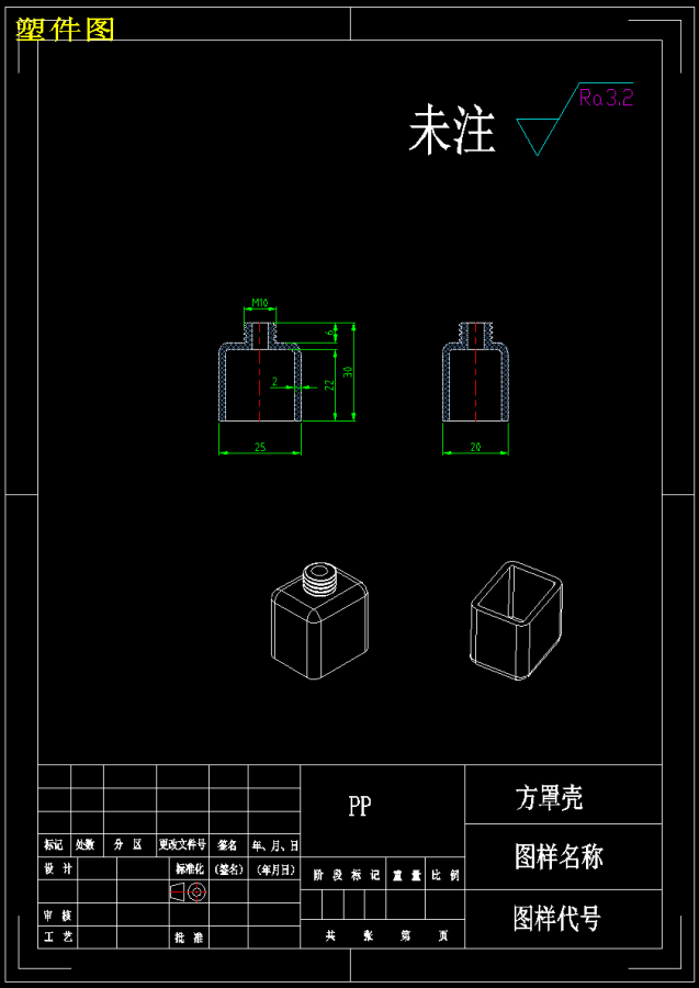 本设计主要对方罩壳进行注塑模具的设计,方罩壳是日常生活中常见的产品,方罩壳的主要工作的执行件,本设计根据所给的方罩壳进行测绘尺寸然后进行3D建模,最后再对其模具进行设计,需要完成的内容如下: 1、对其塑件进行结构和工艺的分析,分析其材料和年产量,并确定模具的结构; 2、对注塑机进行选取,并进行重要参数的校核; 3、选择模具的分型面,对浇注系统进行设计,包括主流道、分流道和浇口的设计; 4、对冷却系统和脱模机构进行设计; 5、完成模具的整体结构设计和图纸的绘制;