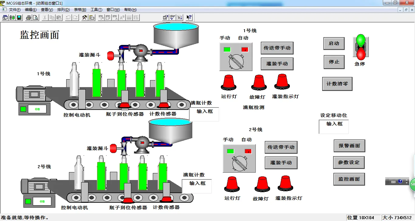 本设计是基于PLC的饮料灌装控制系统的设计,采用西门子的S7-200小型可编程控制器为控制核心,MCGS组态软件为上位机,进行两条饮料灌装线控制,控制饮料灌装输送带电机,电机启动,输送饮料瓶,通过检测传感器,检测到饮料瓶运行到灌装位,停止输送带电机,进行暂停,打开灌装阀,进行灌装,灌装计数,灌装完成后自动启动输送带,循环运行。灌装时,使用灌装指示灯进行提醒。系统具有短路过流保护,过载保护,急停保护,等多种保护措施,安全可靠。通过对饮料灌装控制要求的分析,进行饮料灌装总体设计,进行了硬件设计,软件设计和组态设计,最后进行了测试。经过测试,系统达到了设计要求,符合预期的设计目的。