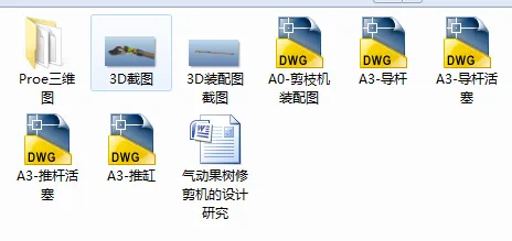 1.设计了一款适用于我国大部分果树树钟的气动剪枝机,先对剪枝机整体结构及其工作原理进行分析,再将气动果树剪枝机结构分为五大结构进行设计。使用Proe三维绘图软件对本设计的气动剪枝机各零件进行三维建模并完成装配,同时使用该软件的机构部分对气动剪枝机进行运动仿真分析。