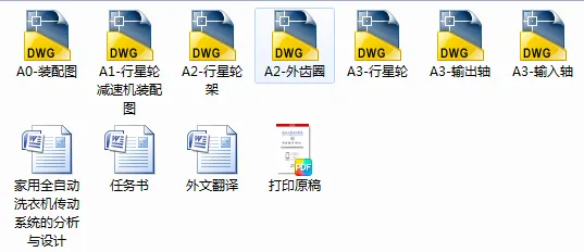 全自动波轮式洗衣机在我国洗衣机市场上占据着主要地位,拥有着水位智能控制,洗涤、脱水一体化。全自动洗衣机主要由洗涤、脱水系统,进排水系统、机械传动系统、电气控制系统、支承机构等 5 大部分组成。此次设计主要是对全自动波轮式洗衣机的机械传动系统进行了设计,传动系统主要由电动机、减速离合器组成。一台洗衣机通过电动机要进行洗涤和脱水两种不同的工作状态,这主要是由洗衣机的传动系统来完成的。全自动波轮式洗衣机的传动系统的设计计算内容较多,但大多数零部件选用无需进行设计,设计内容主要有:方案设计、电动机选用、带传动设计、行星减速器设计等。其中,行星减速器设计为此次设计的重点部分,针对它进行了详细的计算和校核。