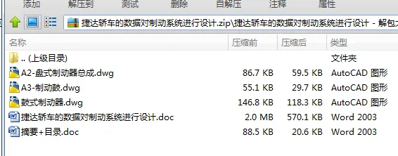 本说明书主要根据已有的捷达轿车的数据对制动系统进行设计。首先介绍了汽车制动系统的发展、结构、分类,并通过对鼓式制动器和盘式制动器的结构及优缺点进行分析。最终确定方案采用前盘后鼓式制动器。除此之外,它还介绍了前后制动器、制动主缸的设计计算,主要部件的参数选择等的设计过程。