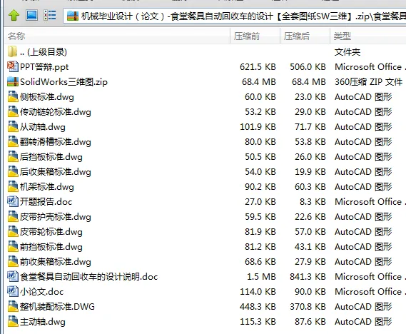 本设计基于筷、勺、碗、碟及剩饭菜之间几何特征、形状特征、物料特性的差异,通过结构创新性设计及工作参数优化,实现碗、碟、筷的自动、快速分类及剩饭菜的分离。本设计是针对我校食堂的常见餐具,不使用机电自动控制及编程技术,是纯机械式机器,采用纯机械设计,是为了降低成本,使用方便,维修简便,本设计原理可靠,结构简单,减低人工劳动强度,提高工作效率,并且保证不损伤餐具。此设计减轻了人力劳动,分离分类准确可靠,适用于高校企业等饮食场所对碗、盘 筷的分离分类。