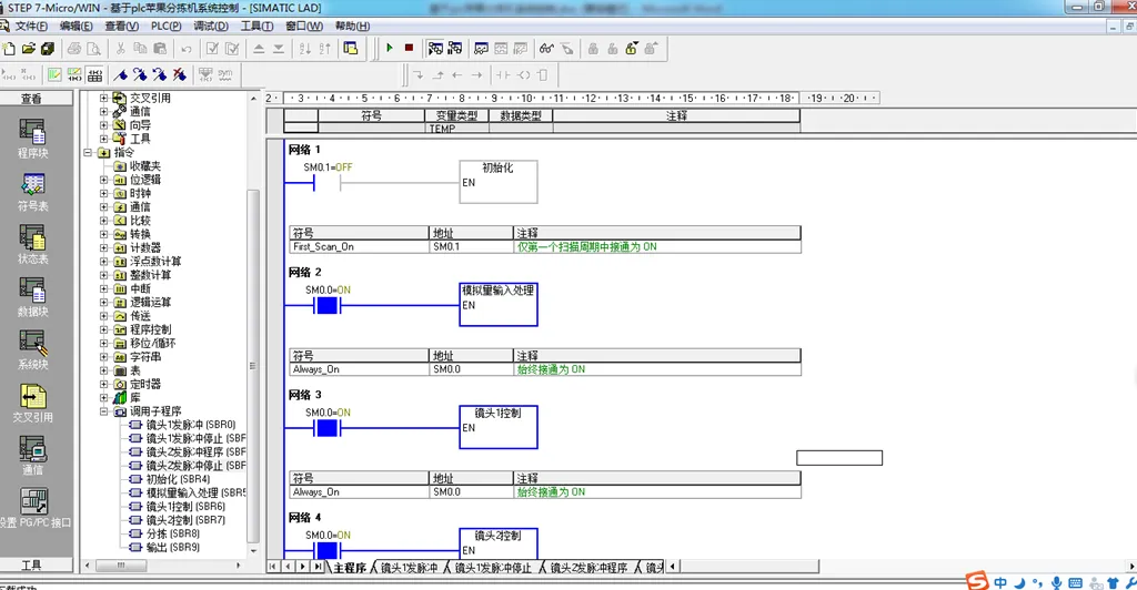 本设计是采用西门子S7-200小型可编程控制器为控制核心,控制2台步进驱动器,分别驱动镜头1和镜头2上下移动,进行定焦,拍照,发送给上位机进行分级,上位机分级后输出信号,PLC根据分级情形,进行分拣,将不同级的苹果分拣到不同的分果箱中。