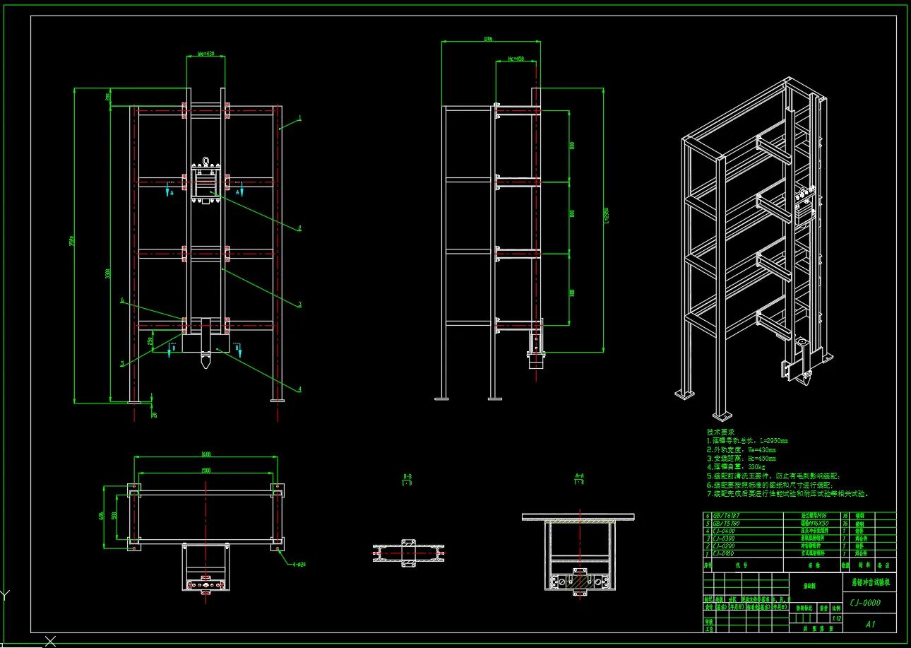 包含全部三维SW2016零部件以及装配,二维CAD(总装配图,冲击锤组件,落轨机架焊合组件)CJ001型落锤试验机是一种适用于金属材料反结构抗冲击性能测试的仪器,立式导轨架设计采用了主支架与辅助支架相结合的结构,保证了具有良好的稳定性和强度,所有支脚均采用了调节螺钉,从而方便地调节支架的垂直度。此外,整体结构均采用10号槽钢,用手工电弧焊接进行连接,使得整体性能更加可靠。基本参数:落锤导轨总长L=2950mm;外轨宽度We=430mm;落锤自重m1=330kg,安装距离Hc=450mm;