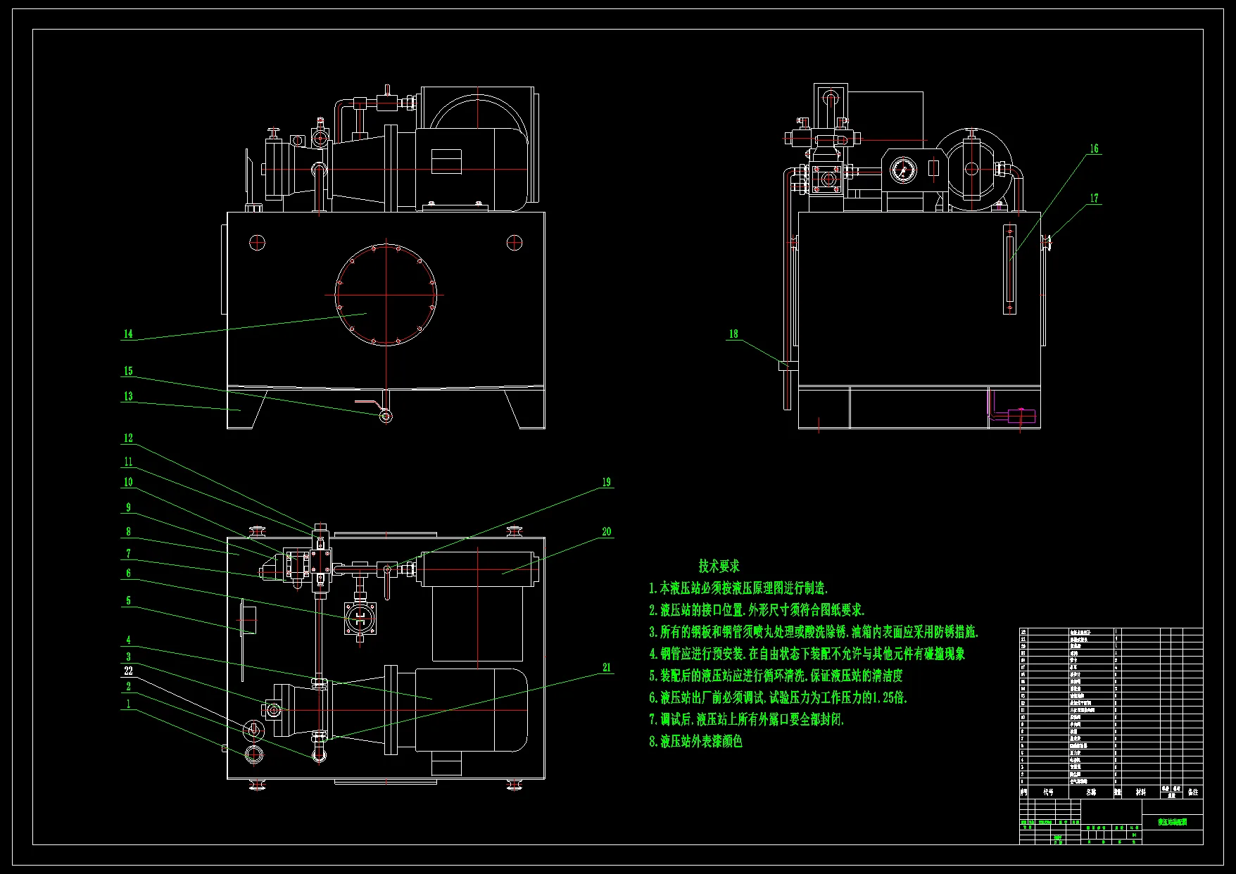 包含二维CAD(液压系统原理图,泵站装配图,油箱焊合图,阀块零件图,集成块装配图),包含三维SW2018零部件及装配。实现测试项目包括:排量验证试验、效率试验、变量特性试验、自吸试验、噪声试验、低温试验、高温试验、超速试验、超载试验、冲击试验、满载试验、效率检查试验及外渗漏检查试验等。