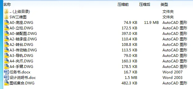 2、若题目上备注三维,则表示文件里包含三维源文件,由于三维组成零件数量较多,为保证预览截图的简洁性,本站将三维文件夹进行了打包。三维及CAD预览截图,均为本站电脑打开软件进行截图的,保证能够打开,下载原件超高清,下载后解压即可;