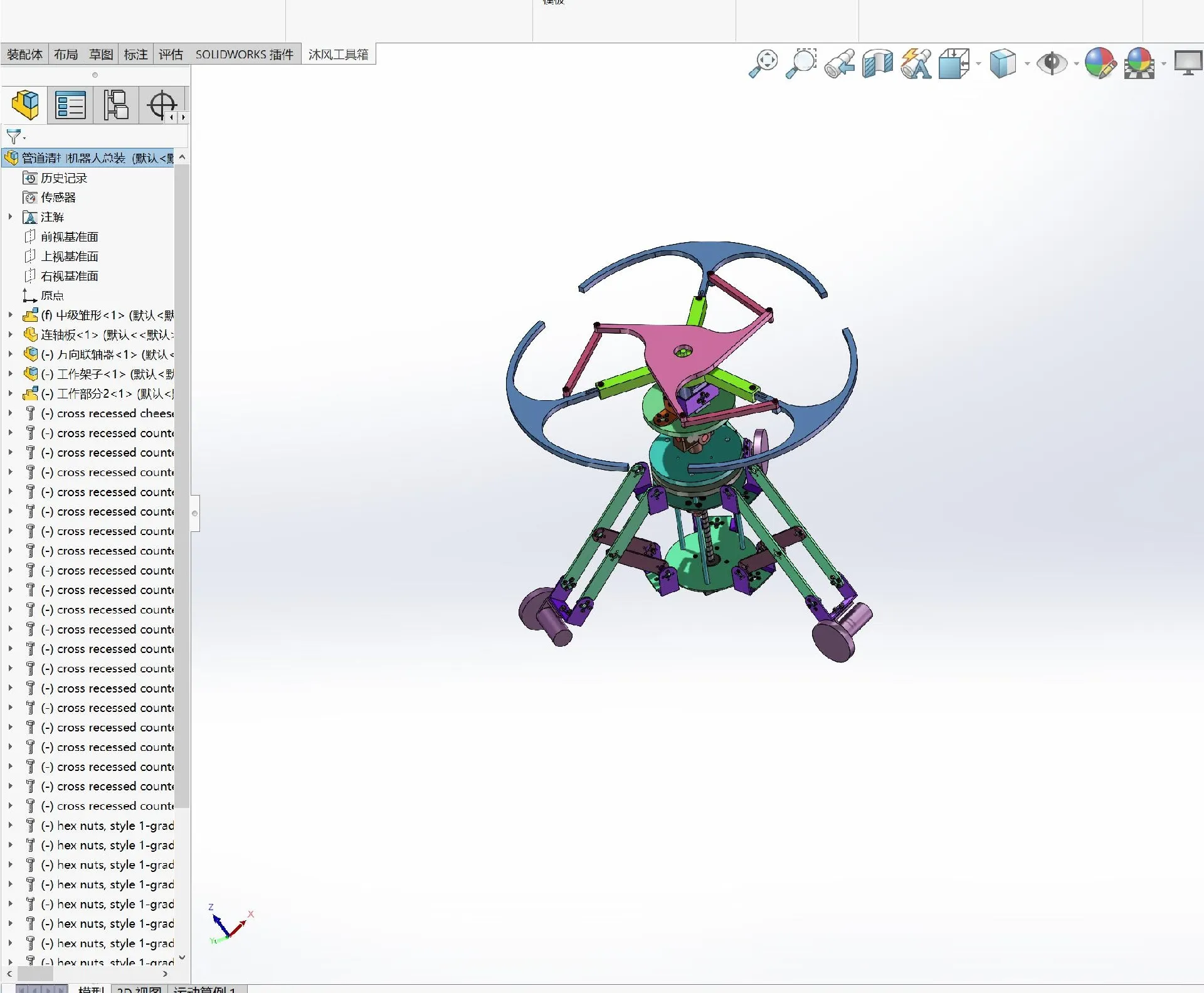本次设计内容是自主设计一款管道清扫机器人。机器人主要由电机、后轮、前轮、万向节、毛刷等组成。基于毛刷的弹性与自适应性,利用电机带动毛刷离心运动,使其贴附管壁进行清扫,并且行走部分和毛刷部分通过万向联轴器联结使其完成转向动作,可实现水平大角度转弯、变径管道清扫等功能,克服了机器人在管道中卡死、打滑等缺点。