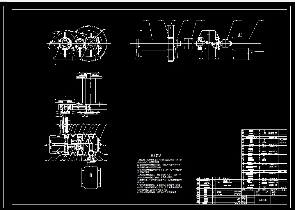 绞车又俗称为卷扬机,是与卷筒,钢丝绳来一起完成对比较重的物体进行搬运工作。它可以垂直提升重物,也可以水平得将重物拖动或者倾斜的拽引重物来完成工作任务。齿轮减速机传动的绞车具有更大的动力,可以应用于需要对重物进行提升和平移等的操作过程中。这种齿轮减速机传动的绞车可以应用在对钢材进行移动或者对机械设备进行安装和拆卸的操作过程中。这种类型的绞车结构非常简单,在对重物进行搬运和转移的过程中,可以节省人力提高工作效率。使用绞车对重物进行搬运。操作并不复杂,绞车的成本不高,对其进行维护保养也相对简单,对于企业来讲是一个投资小效益高的投入。文中首先对电动绞车整体进行了布局,对电动机进行了计算、选择160M1型号的电机,对传动装置的总传动比计算并分配,设计了高速级齿轮、低速级齿轮、输出轴及轴承装置、键的设计,最后对卷筒轴的加工工艺进行了设计。同时通过CAD绘图软件绘制了绞车整体装配图、减速器装配图,以及低速轴大齿轮、卷筒轴、低速轴、中间轴等零件图。