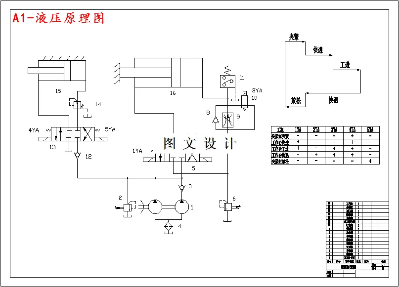 试设计卧式双面铣削组合机床的液压系统。机床的加工对象为铸铁变速箱箱体,动作顺序为夹紧缸夹紧——工作台快速趋近工件——工作台进给——工作台快退——夹紧缸松开——原位停止。工作台移动部件的总质量为400kg,加、减速时间为0.2s。采用平导轨,静摩擦系数为0.2,动摩擦系数为0.1,夹紧缸行程为30mm,夹紧力为 800N。工作台快进行程为 100mm,快进速度为 3.5m/min,工进行程为 200mm,工进速度为 80~300mm/min,轴向工作负载为12000N,快退速度为6m/min。要求工作台运动平稳,夹紧力可调并保压。对机床液压系统设计,在进行充分论证的基础上,设计液压缸等有关零部件,计算其参数。