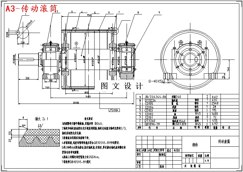 本设计是普通胶带输送机选型设计。首先是对带式输送机的现状和应用进行阐述,并介绍了我国胶带输送机的研究发展情况;其次介绍了胶带输送机的一些基本原理,如布置、拉紧等;接着介绍胶带输送机的一些基本计算公式;最后针对一个基本原始数据进行胶带输送机的选型设计。胶带输送机在国民经济各部门应用非常广泛,从常规上可分为普通型和特殊型。本文着重介绍普通型胶带输送机的设计,普通型胶带输送机主要由胶带、中间架、头架、尾架、拉紧装置、托辊和滚筒等零部件组成。在选择这些部件时要根据运距、输送物料的性质及运输机所在场合等来确定。选择胶带时要依据运送物料的最大块度来首先决定,式来计算确定,然后进行验算。带输送速度的确定要依据带宽及运送物料的性质、运距等进行确定。根据所选资料,确定驱动型式和计算各点张力,根据计算结果进行功率计算来选择电动机型号和制动器的型号。后根据以上数据进行标准件的选择和验算,并进行总体布置设计和画出相关零部件图。