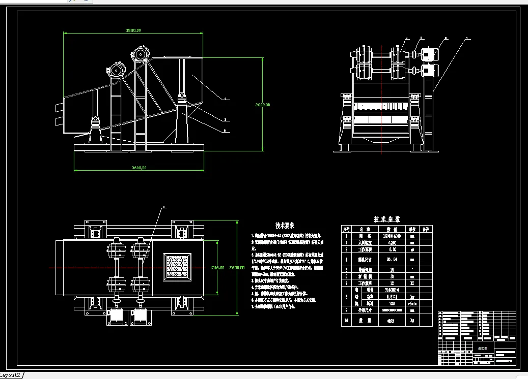 ZSG型系列高效直线振动筛是一种新型高效的通用筛分设备,其筛箱运动轨迹近似为直线。该系列筛机结构简单,筛分能力大且能耗少,维修方便,广泛应用于矿山、煤炭、电力、冶金、建材、耐火等各行各业对较大块状物料及中、小颗粒状物料的分级作业。该系列高效直线振动筛的动力装置有振动电机直接驱动和普通电机通过联轴器带动激振器间接驱动两种形式,可满足不同环境需要;筛面有金属编织网、棒条、铸造、焊接、冲孔等多种形式,筛面既有单层结构也可多层布置,可满足不同筛分作业工作。本设计是以 2ZSGB15-40J矿用闭式高效直线振动筛为研究对象,简要描述了直线振动筛在国内外研究概况及发展趋势。并且根据直线振动筛的工作原理,设计和选取了所研究振动筛的参数。并进行了静力学和动力学分析。设计内容包括:激振器轴系的设计,箱体结构的设计,激振器在箱体上的布置,传动装置的选取,电动机的选择,轴承的选择与校核,弹簧的设计,横梁的设计计算及校核等诸多方面。