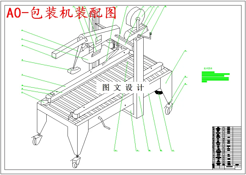 本设计的是全自动包装机,采用的是两侧摩擦带驱动来进行密封纸箱的方案。本设计的全自动包装机,可以根据纸箱的大小,调整工作区的宽度和高度,可以单独工作,也可以和自动化包装线组在一起匹配使用;包装机工作的时侯,把纸箱从机台输入端推入(箱子顶部的封口盖须竖起来),被摩擦带带动的时侯就可以松开手了,当纸箱运动到折盖的挡板时侯,装备的气缸活塞开始工作,它可以推动后折盖摆锤升起,当纸箱全部经过折盖控制的挡板时侯,折盖的控制系统会复位,然后气缸活塞就会收缩,后折盖摆锤落下,敲下纸箱的后盖,纸箱两侧的盖在摆杆作用下完成侧盖折盖的动作,即可完成折盖封箱目的;折盖顺序为:前盖、后盖、左右侧盖, 当纸箱运行到胶带封箱位置时,箱体在运动压力的作用下将刀架和前胶带压轮压退位,而后面的压轮会在四杆装置的作用下,与前面的压轮保持相同方向运动地退位,会使前面装的胶带与纸箱粘贴并密封纸箱;随着纸箱运动的前进,胶带会不断地抽出粘贴在纸箱的盖上,当纸箱的后部远离密封箱装置时,前面的胶带压轮由四杆装备的作用与后胶带压轮的运动保持一致,而刀架会受到弹簧反弹的作用,回到原来位置弹起,切断粘贴的胶带,当纸箱运动到离开后胶带压轮的时侯,后胶带压轮也会受到可调动弹簧回复作用而复位,会使连接在纸箱上最终的胶带也贴在箱体上,完成后段封箱任务。