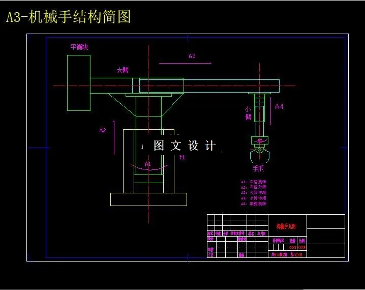 本次设计的多功能机械手用于R175型柴油机机体加工自动线上,主要由手爪、手腕、手臂、机身、机座(立柱)等组成,具备上料和转位等功能,并按该自动线的统一生产节拍和生产纲领完成以上动作。本机械手机身采用机座式,自动线围绕机座布置,其坐标形式为圆柱坐标式,具有立柱旋转、立柱升降、大臂伸缩、小臂升降、腕部转动4个自由度,外加一个重复自由度-小臂升降。驱动方式为液压驱动,且选用双联叶片泵,系统压力为2.5MPa,电机功率为5.5KW,共有整机回转油缸、立柱伸缩缸、大小手臂伸缩油缸、手腕回转油缸、手爪夹紧油缸6个液压缸;定位采用机械挡块定位,定位精度为0.5~1mm,采用行程控制系统实现点位控制。