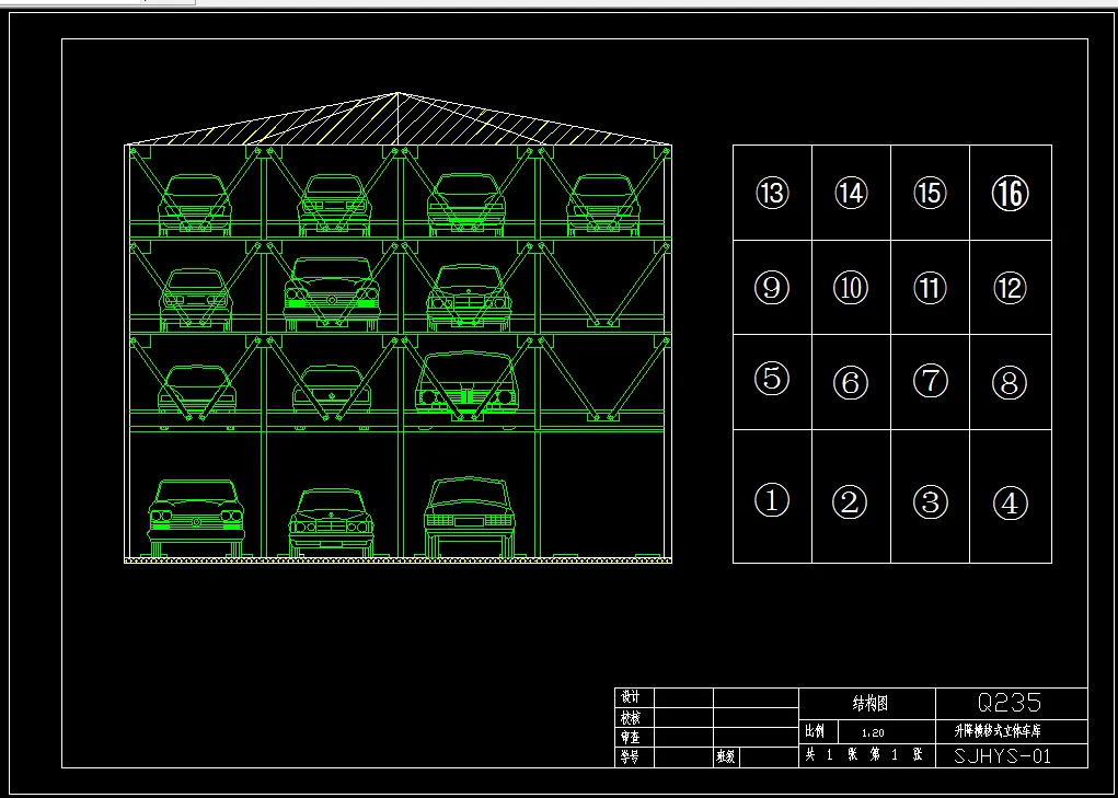 机械式汽车库近年来也在我国一些大城市中兴起,虽然尚存在各种各样的问题,但经验也正在积累中它具有高效、安全、节省空间等优势,机械式汽车库的发展将会有广阔的前途。城市化进程的加速,日益增多的汽车带来了城市停车场不足以及由此引发的一系列问题,已经成为困扰我们的一个社会问题,迫使我们在城市中紧凑的地域内对停车空间,停车方式进行新的探索。停车库也由地面向地下,由单层向多高层发展,停车方式亦由坡道式向机械式发展。本文是使用机械设备作为运送或既运送且停放车辆的汽车库,在一个建筑层里叠置3-4层存放车辆的汽车库,根据国家相关规定,在确保安全的情况下,使车库切合实际,并且安全稳定。