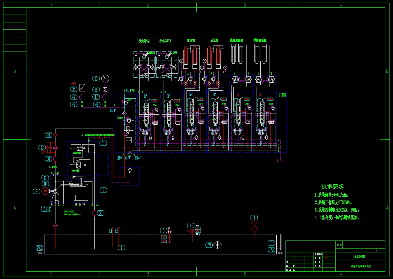 履带行走液压支架的液压系统由一个负载敏感伺服比例变量泵提供动力油源,多路比例换向阀组作为控制元件分别控制六条支路,六条支路分别为左行走马达系统、右行走马达系统、前立柱系统、后立柱系统、逃逸系统和犁煤系统。 系统工作压力:25MPa 系统工作流量:250L/min 犁煤负载力:900KN