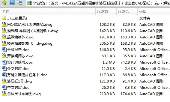 在全面了解磨床结构、工作原理、液压系统的基础上,论文对磨床总体尺寸进行布局及对液压系统进行设计。M1432A型万能外圆磨床主要以磨削圆柱形或圆锥形(包括阶梯形)的外圆表面和内孔,成品的尺寸精度可达1~2级,表面光洁度可达T8~T10。对机床液压系统有着较高、较复杂的要求。用液压系统实现工作台的自动往复运动、砂轮架的快速进退、尾架顶尖的伸缩以及必要的联锁动作。