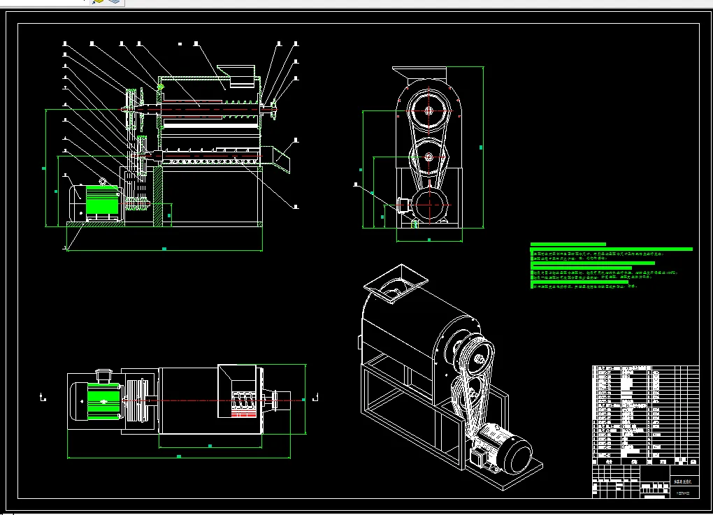 该研究以油茶果脱壳机的机械设计为核心展开,该装置整合了脱壳部件、分选装置、传动机构与支撑机架等功能部件。为提升油茶果脱壳及分选作业效率,研制出油茶果脱壳与分选联合机组:主要攻关方向是提升脱壳系统的处理能力,以减少茶籽的破碎率,实现脱壳与分选工序的协同配合。该装置作为机构的核心脱壳组件,核心结构采用滚筒,采用滚筒主轴加上弧形栅板。当设备处于运行阶段,电机依靠皮带传动实现带轮转动,脱壳主轴由大带轮直接驱动,牵引滚筒与与弧形栅板挤压摩擦将油茶果破壳,破壳后进入分选主轴完成壳与油茶籽的分离。