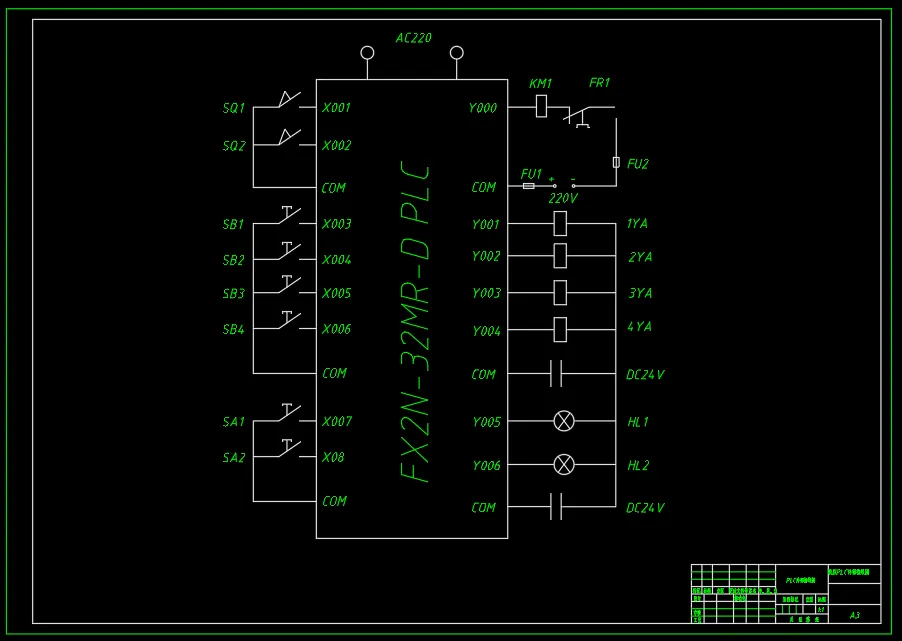 铣床液压系统,包含液压系统原理图,液压系统装配图,液压缸工况图,速度和负载图,电气控制原理图,外部接线图,梯形图,设计计算等。(1)实现功能:夹紧—快进—工进—快退—夹紧松开—停止的工作循环 (2)基本参数:切削负载力15000N,工作台移动部件重19600N,工作台启动时间(加减速时间)设定为:0.2s,采用平导轨,静摩擦系数0.2,导轨面动摩擦系数0.1,工作台快进行程200mm,工进行程200mm,快进与快退速度相等,均为10m/min,工作台工进速度为100mm/min,夹紧缸行程Lc=30mm,夹紧缸运动时间tc=2s,导轨面的液压缸机械效率为0.9。