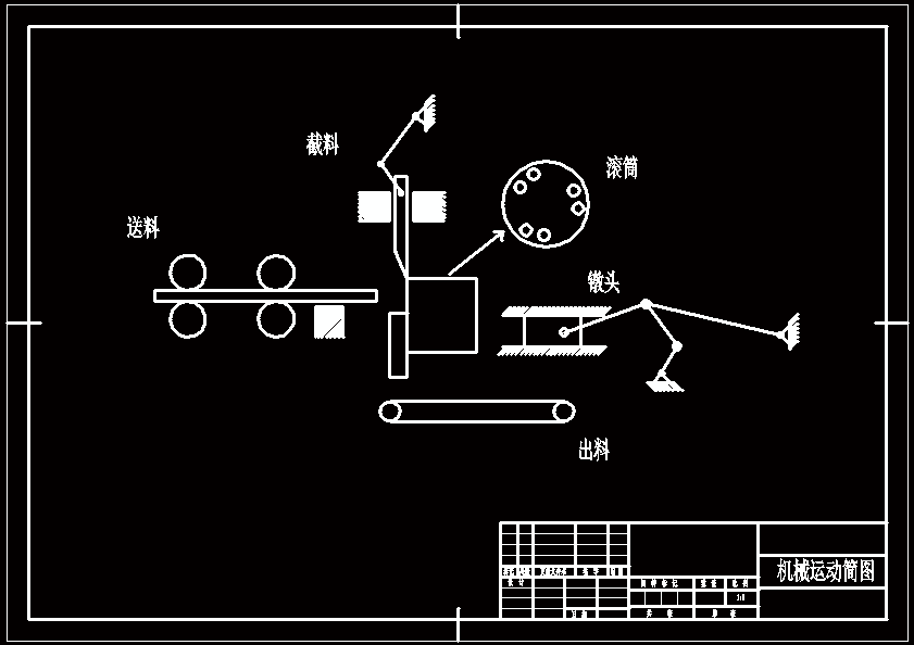 螺钉头冷镦机设计 设计为螺钉头冷镦机,能够实现自动机料、截料、冷镦,每分钟冷镦螺钉头120只,生产效率高。驱动方式采用带传动形式,传动平稳,设计简单。本设计螺钉头冷镦机工作时原坯料由摩擦轮带动送入分度圆盘,分度圆盘间歇转动,当其不转时,冷镦机依次完成送料/顶料、截断原料、预镦、终镦这四个动作,其中送料和顶料通过同一动作完成。本设计首先确定出总体设计思路,并列出主要设计参数。然后,分别进行了螺钉头冷镦机的送料机构、截料机构、夹紧机构、冷镦机构和传动机构等常用设计方案的评定和选择,并绘制传动方案图和机械运动简图,按工艺动作顺序和协调要求拟定运动循环图。