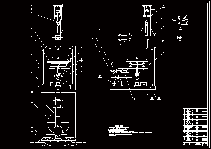 轮胎侧面撞击试验装置机电系统设计 主要内容是对轮胎侧面撞击实验装置的总体的布局、传动机构方案比较、气压控制系统、电气控制系统以及安全保护系统的分析和设计。设计中充分考虑到现有普通轮胎拆装机的状况,基本保持了原轮胎拆装机的功能并兼顾了原有扒胎机设备的一些性能,增加了工作盘转速可变功能(变频调速)、横臂可沿轴线伸缩并且可绕轴线旋转功能、冲击杆冲击轮胎侧面功能、立柱可后倾功能、气动门保护功能等。
