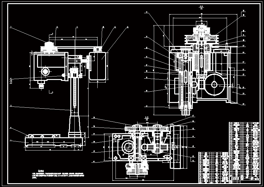 自动攻丝机的设计 本次设计的任务是自动攻丝机的设计。自动攻丝机一般由主传动系统,丝锥驱动系统,机架和工作台等部分组成。 攻丝机主要有三种驱动方式:气压驱动,液压驱动,电机驱动。气动马达转速高,扭力小。气动攻丝机效率高,操作方便,但是由于扭力小对大直径的内螺纹能力不足。液压驱动式攻丝机输出扭力大、攻丝速度快、操作方便、适用于加工大工件,攻牙多,尺寸大的模板和机床部件。电机驱动攻丝机通过电动机和传动方案的不同可以调节扭力和转速的输出。能同时满足小直径的内螺纹加工和大直径内螺纹的加工,传动稳定,生产技术成熟,在攻丝机领域依然占有很重要的地位。选电机传动为本机的最终方案,加上立式机架。 在确定传动方案之后,本设计根据攻丝的最大直径及行程,设计计算主传动齿轮及丝锥进给机构的蜗杆蜗轮和齿轮齿条机构,然后设计校核轴和轴承。