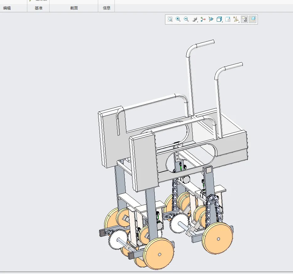 养老助残机器人设计机械系统结构设计 针对助老助残服务机器人的需求,提出了一种平地、楼梯两用养老助残机器人的设计方案,设计了爬楼梯机构实现机器人爬楼梯功能,并分析了各部分机构工作原理。在前轮通过连杆导轨机构调节运动过程中的车体姿态,保证车体水平,并减小了机器人车体的波动程度,同时后轮采用两组电机分别控制驱动,能够实现任意转弯。