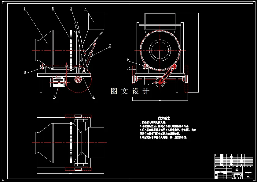 混泥土搅拌机结构设计 该建筑生产混泥土搅拌机实现了混泥土搅拌、卷扬机进料、反转出料等功能并实现了高效率混泥土搅拌的目的。减轻了建筑工人的劳动强度,提高了劳动生产率。