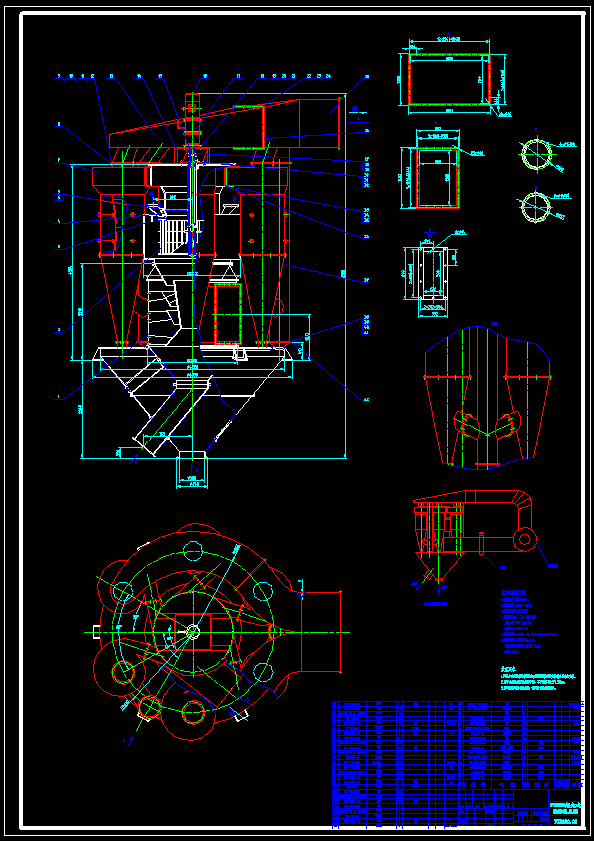 FXS900组合式选粉机总体及双出风口分离器设计 摘要:选粉机是圈流粉磨系统的主要设备之一,通过选粉机对粉末粒径的选择,能够很大程度上减少细粉重新进磨,解决对粗粉粉磨的缓冲作用问题,从而提高粉磨效率,进而提高了能源利用率。本课题设计的是FXS900组合式选粉机,它是在旋风式选粉机的基础上进行改进而成的一种高效旋粉机。该设计吸收了O-SEPA选粉机的的先进悬浮分散技术和平面涡流理论,并在选粉机主体四周设有旋风筒来收集细粉。设计内容分为选粉机总体设计和双出风口分离器的设计。在进行总体设计时,通过风量的计算选择风机,确定旋粉室直径与转子直径,再计算主轴的转速和选粉机的功率,选择电机和减速机。双出风口分离器的设计是我此次设计的重点。双出风口分离器的结构设计主要是在单出风口分离器的基础上改进而来。传统的旋风分离器存在下述三个主要缺陷: a.旋风分离器中心净化气流是一股较强的旋涡流无用压力损失占分离器总压力损失65%以上。 b.在上进风口与上出风口间存在短路流。 c.锥部集料口因气流转向而导致已沉降微细粉尘“二次返混”。 通过在筒体内增设可调节开度的导流口,改善了旋风分离器内的流场,使得分离器的捕集细粉能力有了显著的提高,为现行组合式选粉机改造拓展了市场。