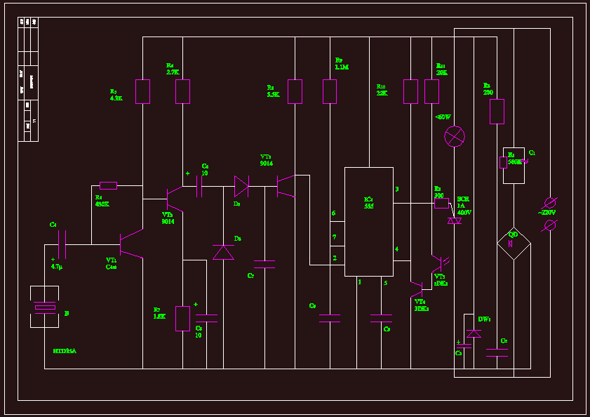 声光双控开关设计在本设计中介绍了多种声光控路灯控制器的组成、性能,适用范围及工作原理,给出各电路原理图及元件参数选择,节电效果十分明显,同时也大大减少了维修量、节约了资金,使用效果良好。白天光照好,不管过路者发出多大声音,都不会是灯泡发亮。夜晚光暗,电路的拾音器只要检测到有碎发声响,就会自动亮为行人照明,过几分钟后又自动熄灭,节能节点。