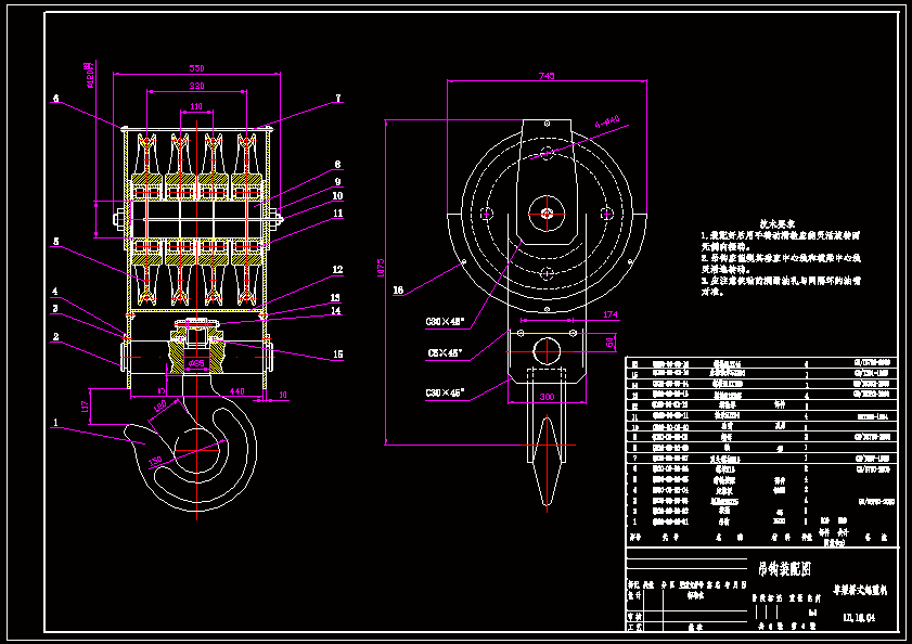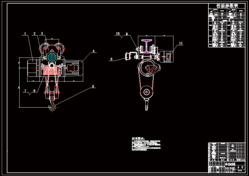 LD-10单梁桥式起重机总体及起升机构设计该桥式起重机的起重量为10吨,跨度为12米,起升高度为9米,起升速度为0.6m/s,小车运行速度为0.6m/s,机械部分主要由小车架、卷筒、吊钩、桥架横梁和操纵室等构成。 桥式起重机可实现升降、平移两种工作模式,本设计中根据起重量、起升速度和运行速度计算出电机功率、减速器、卷筒及各联轴器型号,并以此依据来选型,综合考虑多方面的因素,根据桥式起重机工作环境设计了起重机的安全保护措施,例如:在起重机的起动和运行过程中首先考虑到对制动的保护;以及对运动位置的限位保护等;同时各个系统有相应的安全保护措施来保证起重机安全可靠运行。