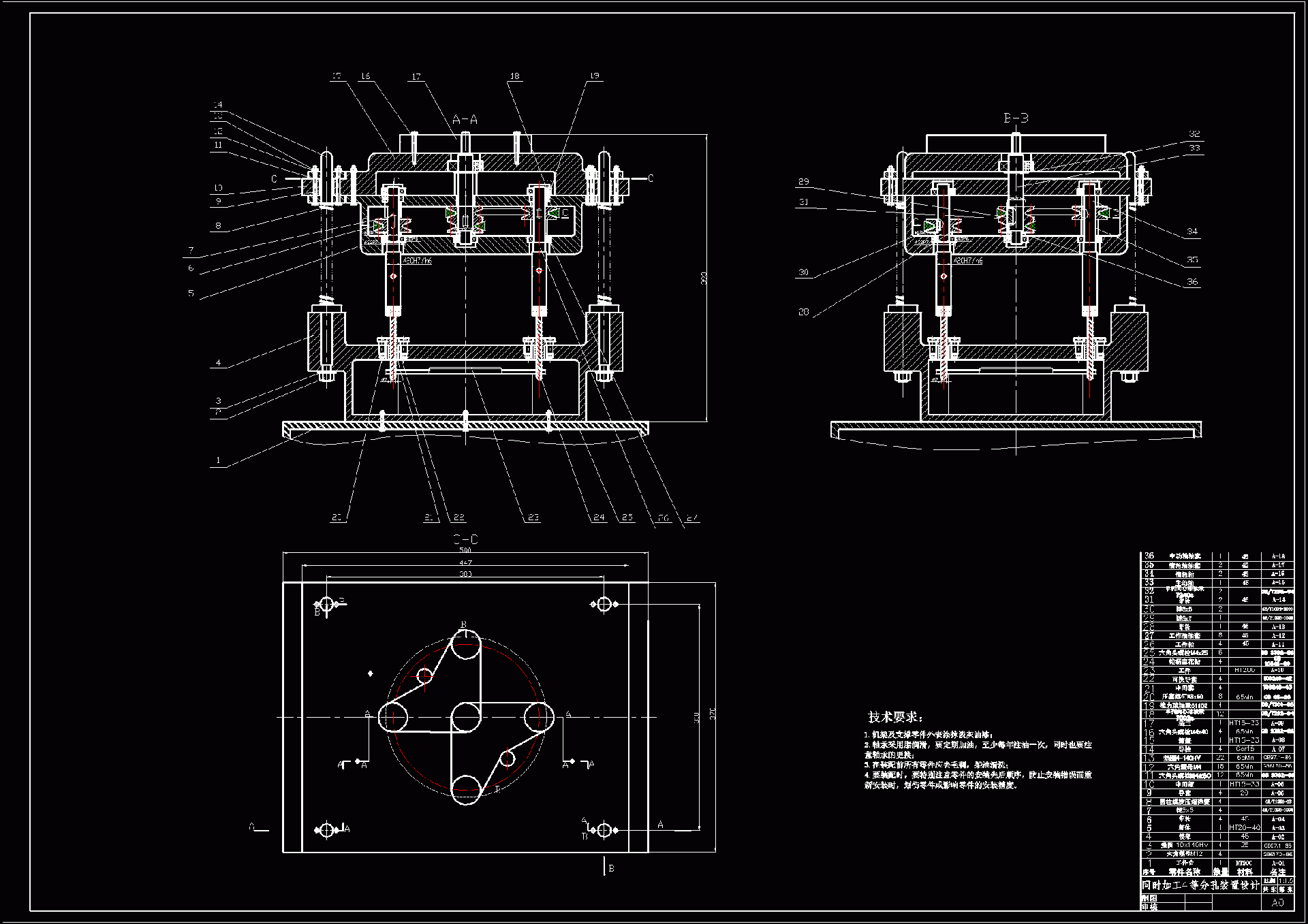 同时加工4等分孔装置的设计 根据设计任务书的要求, 某厂需在盘类零件ф150上加工4等份ф6通孔,由于批量大,为提高效率和保证孔距质量,改造立钻(Z525),同时加工4等份ф6通孔;设计该装置。 本设计说明书针对盘类零件同时加工4等分孔装置的设计设计进行说明。主要内容包括装置工艺方案的制定、装置配置型式的选择、装置总体设计以及主轴箱设计。 全文主要包括装置的总体设计和主轴箱设计两部分。机床总体设计主要是在选定工艺方案并确定机床配置形式、结构方案基础上确定“三图一卡”,主轴箱设计根据“三图一卡”,整理编绘出主轴箱原始依据图,重点分析传动系统,经过各种方案的比较,最后确定最优方案。