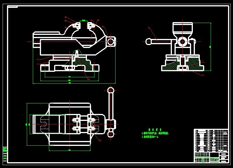 台虎钳的设计 台虎钳,又称虎钳,台虎钳。台虎钳是用来夹持工件的通用夹具。装置在工作台上,用以夹稳加工工件,为钳工车间必备工具。转盘式的钳体可旋转,使工件旋转到合适的工作位置。 台虎钳是一种在工作台上用来夹持工件、以便于对工件进行加工的夹具。台虎钳装配图采用了俯视图、主视图、三维立体图和一个表示单独零件的爆炸视图来表达。主视图采用了全剖视图,反映台虎钳的工作原理和零件间的装配关系。俯视图反映了固定钳身的结构形状。 根据使用条件的不同,加工环境的不同,人们还会对台虎钳进行进一步的改进创新和功能的拓展,会有越来越多不同的结构使台虎钳的使用功能多样化、全面化。