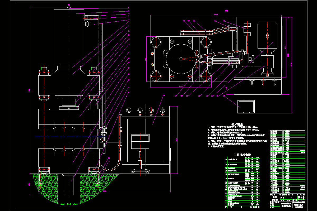作为世界加工中心,我国机械工业在国民经济中的基础作用越来越明显。液压机技术水平的高低直接影响到国家机械工业的发展水平。四柱式通用液压机是液压机产品的一个重要组成部分,拥有自主的液压机设计技术是使国家机械工业能在世界竞争中取胜的重要保证,对其展开研究有重要的理论和实际意义。 本文完成了2000KN四柱式通用液压机本体的设计,并采用二维制图软件AutoCAD对其进行研究。说明书提出了2000KN四柱式通用液压机的技术参数,拟定了机器的结构形式,着重对工作缸做了结构设计和数据计算,对液压机工作缸柱塞和活动横梁的结构连接以及回程部分进行了简要设计。根据液压机设计理论完成了整体机架结构及主要结构部件的设计与理论计算并详细讨论了该机器的预紧问题。对液压机本体的总体结构和的关键部件进行了强度计算与分析,主要内容包括:结构中应力集中情况分析,初始设计方案修正,最终获得了满足强度和刚度要求的机架设计。最后利用AutoCAD软件对2000KN四柱式通用液压机总装配图及主要零部件进行了设计,完成了液压机的整体结构设计。