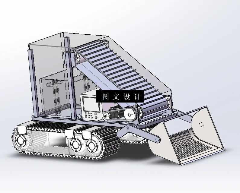 沙质土壤分布区,枣、杏、沙棘等林果作物的自然落果现象普遍存在。受风力作用、成熟度不均衡或采摘不及时等因素影响,大量果实脱离枝干散落于地表,形成具有经济价值的“落地果”。此类果实因接触沙土易受污染、霉变或虫蛀,需及时采收以保障商品价值。然而,当前沙地落地果的收集作业仍以人工捡拾为主,劳动者需在松软沙土中长时间弯腰劳作,日均作业面积不足0.5亩,效率低下且劳动强度极高。本研究针效率低、成本高的技术瓶颈,以沙质土壤落地果实收获装置为研究对象,开展结构与传动系统的创新设计。基于机械-沙地相互作用模型,通过方案对比分析,用推土机式工作结构,捡拾机构机构由铲斗,液压油缸,铲斗将果实推入斗内,液压油缸通过连杆机构,连接铲斗,获取果实。输送带机构由柔性带体、驱动滚筒、惰轮及条状橡胶挡板构成核心组件。装置通过主动轮旋转带动环形带运动,从动轮维持张力平衡,隔板防止物料滑移。主动轮带动传送链将果实投入果实收集盒。完成行走机构、动力系统及关键部件的参数化设计。采用理论建模与工程校核相结合的方法,优化传动系统。