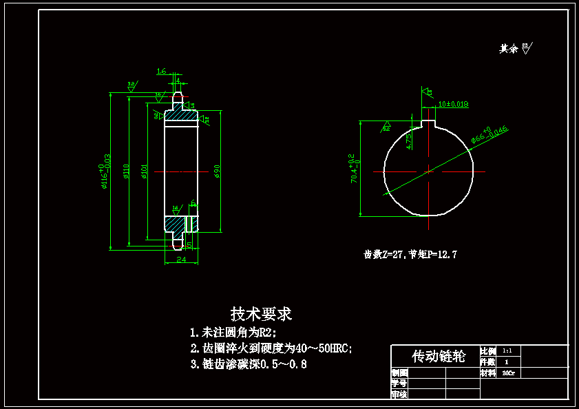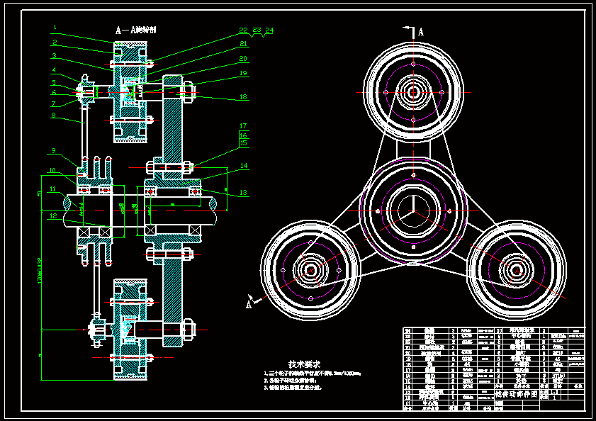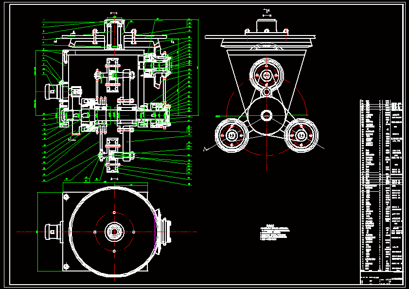 本次设计的项目根据实际设计工作的需要,对机器人链式(行星)越障轮组机构主要的零部件进行设计。对机构各部分的零件进行设计布局,算出齿轮的齿数、模数、齿宽、变位系数和中心距等关键参数,设计轴的结构及尺寸,链轮等.并进行几何尺寸计算、强度计算和安全系数计算。 全方位越障车轮组由动力装置、转向装置和驱动轮系组成。框架上安装了中心轴,中心轴上设有驱动离合器、转向离合器、转臂和中心链轮。每组车轮组的3个车轮轴线呈等角分布。当驱动离合器闭合、制动器制动,转向离合器脱开时,且路面对车轮作用力变化的情况下,驱动轮系亦相应转化构成定轴轮系或行星轮系,实现车轮的驱动或越障。而当制动器脱开,转向离合器闭合时,动力通过啮合齿轮副、转向链轮副和锥齿轮副,使框架相对于车体转动。按轮系传动时齿轮的轴线在空间的相对位置是否固定,轮系可分为定轴线齿轮传动和动轴线齿轮传动两大部分。 整个机构结构简单且行之有效,可广泛用于排爆,救援等危险行业,也可用于高层建筑的外壁清洗,以及管道等狭小空间的作业等。而其未来的发展方向是趋于机械与自动控制,传感技术,PC微机技术相结合,使其逐渐具有信息的收录,分析,和判断能力,真正实现独立自主。