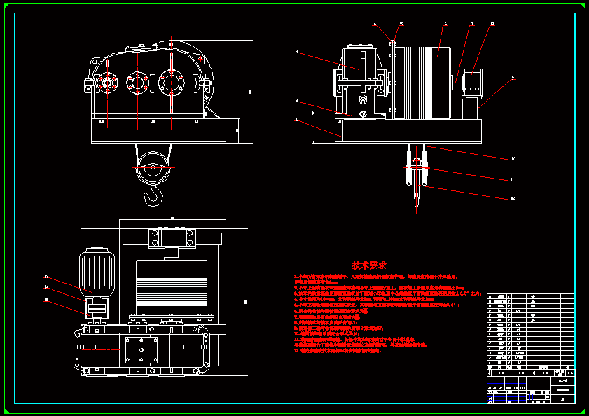 卷扬机又称绞车。是起重垂直运输机械的重要组成部分,配合井架、桅杆、滑轮组等辅助设备,用来提升物料、安装设备等作业,由人力或机械动力驱动卷筒、卷绕绳索来完成牵引工作的装置。垂直提升、水平或倾斜曳引重物的简单起重机械。分手动和电动两种。现在以电动卷扬机为主。本次设计的2.5吨电动卷扬机是由电动机、连轴器、制动器、减速器、卷筒、导向滑轮、起升滑轮组、吊钩等组成。 本次设计的步骤是从钢丝绳开始入手,然后依次对卷扬机的卷筒、卷筒心轴、电动机、减速器齿轮、减速器轴、制动器、联轴器以及卷筒机的导向滑轮设计与选取。其中卷筒、卷筒轴、卷筒毂、减速器的设计最为主要,本设计重点做了介绍,其余部分有得只是略作分析。 本次设计的卷筒机由于它结构简单、搬运安装灵活、操作方便、维护保养简单、对作业环境适应能力强等特点,可以应用于冶金起重、建筑、水利作业等方面,但是此次设计的卷筒机主要运用于用于2.5吨矿井提升机构。提升重物是卷扬机的一种主要功能,各类卷扬机的设计都是根据这一要求为依据的。
