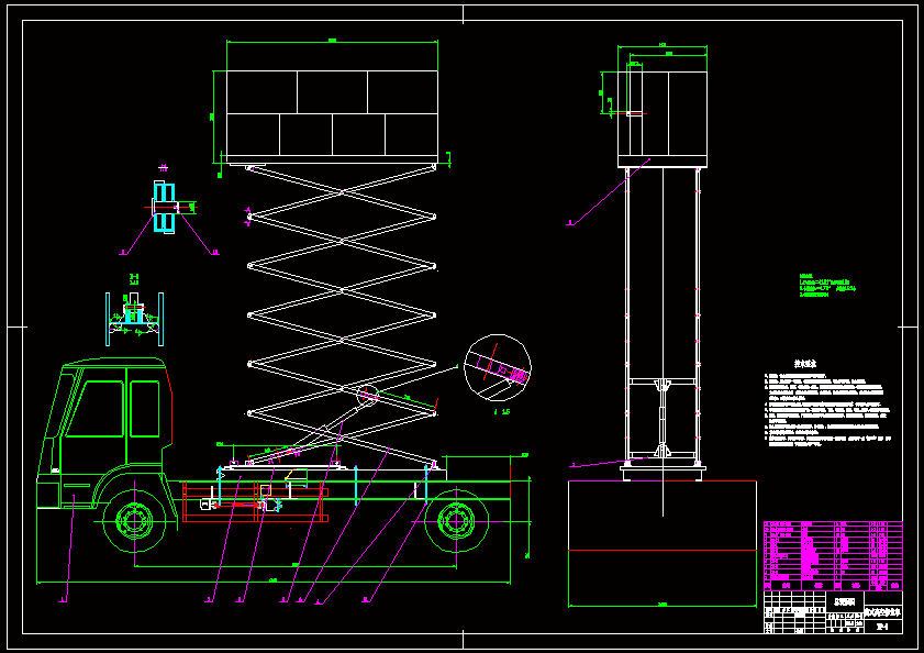 高空作业汽车是用来运送工作人员和使用器材到达指定现场,进行作业的专用汽车。高空作业汽车广泛用于邮电通信、市政建设、消防救护、建筑装饰、高空摄影以及造船、石油、化工、航空等行业。它具有机动灵活、转移迅速、覆盖面广、便于接近、到达作业地点能迅速投入工作等特点。而且高空作业车结构比较简单,改装较容易,因而发展较快。 剪式举升机构,是多组交叉连杆框架铰接成剪型。一般是通过装在连杆框架间的液压缸的伸缩来改变连杆交叉的角度,从而改变举升机构的升降高度。这种垂直升降的剪式举升机构,能完成较低高度的作业,工作平稳,作业平台较大,被广泛的用于飞机、船舶制造、室内维修、清洁电车线路等作业场地。 中国高空作业机械生产企业从20 世纪70年代起步,至今已有30多年的历史。到目前为止,国内高空机械生产企业已由当时的7、8 家发展到100余家。近几年中国高空作业机械的发展主要表现在以下3个方面:品种数量不断增加,产品性能有较大提高, 市场份额进一步扩大。 本次设计主要内容:对多级剪使高空作业车的工作机构进行力学分析,确定举升机构,对剪式机构进行强度校核,进行剪式机构设计。