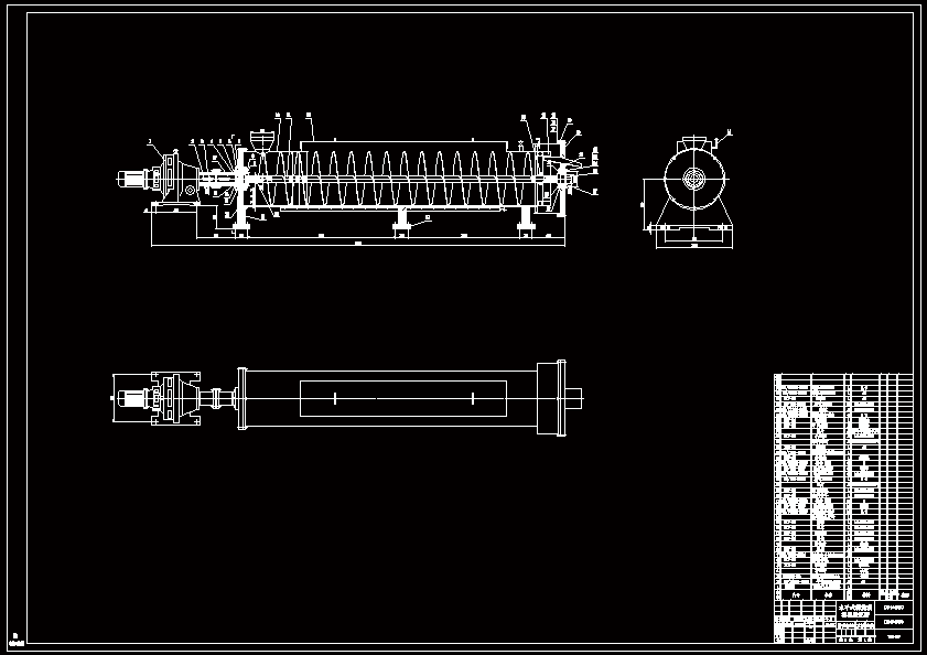 水平式螺旋预煮机是利用螺旋输送原理实现果蔬连续预煮的设备。在工作过程中.果蔬原材料被连续地送到预煮机加料口后,便被预煮机中的螺旋推送到出料口。物料在预煮机中披浸在热水或沸水中,以避免与空气接触产生褐变,同时获得均匀—致的预煮效果。 本人首先根据设计要求以及预煮技术对各个执行机构和传动机构进行选择。在此基础上,初步确定水平螺旋预煮机由动力传动装置、预煮装置、螺旋输送装置、出料装置与连接支撑装置等几部分组成。动力装置选择了调速电机,减化了传动装置,提高了设备效率;预煮装置是由蒸汽管将热量传递给筒体内的水,完成预煮过程;螺旋输送装置是在满足预煮的前提下确定螺旋的相关直径与长度,同时对螺旋轴进行了结构设计,保证其能方便制造与安装;出料装置是保证预煮好的物料顺利地从热水中沥出来并输送出去;连接支撑装置上,采用了螺旋轴孔与花键连接,花键可以缓解螺旋轴因受热的轴向伸长。 设计重点是螺旋输送装置和连接支撑装置等。传动装置的设计中的电机、齿轮、轴的选择、设计与校核也进行了必要的设计说明。