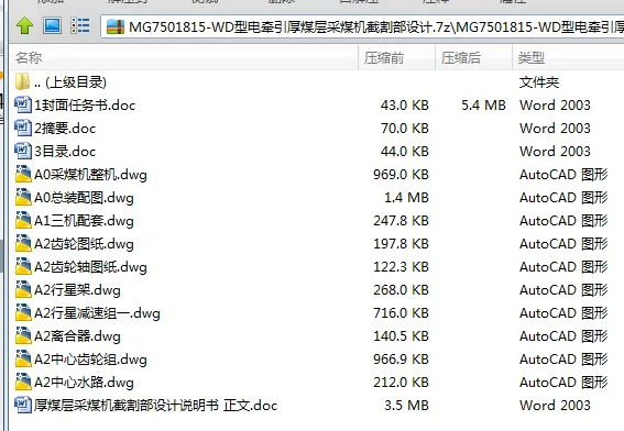 设计中所介绍的采煤机截割部适用于倾角 的中厚煤层和厚煤层的开采。它的传动方式为:电动机—摇臂—行星齿轮传动—滚筒。这种传动方式的电动机轴与滚筒轴平行,取消了容易损坏的锥齿轮,使传动更加简单。截割电机横向布置在摇臂上,摇臂和机身连接没有动力传递,取消了纵向布置结构中的螺旋伞齿轮和结构复杂的通轴。
