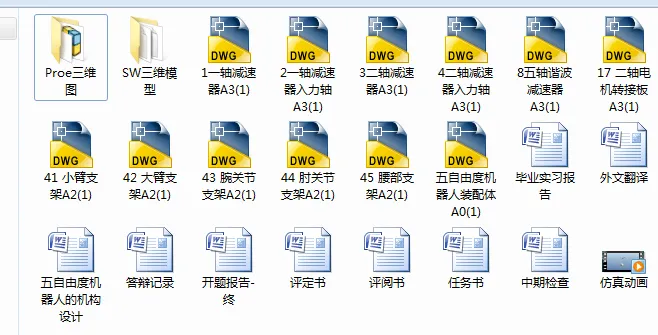 本次毕业设计设计了一个五自由度串联机器人。大致流程如下:首先计算出执行端所需要的驱动力矩,再由此选出该关节所需的伺服电动机和减速器,设计出机壳和关节的连接结构,绘制3D图,做出三维动画,通过软件的测量求出设计好的部分重心,求出下一个关节所需的驱动力矩,选出所需的减速器和伺服电动机,以此类推最终完成总体设计,并且绘制了串联五自由度机器人的工程图。