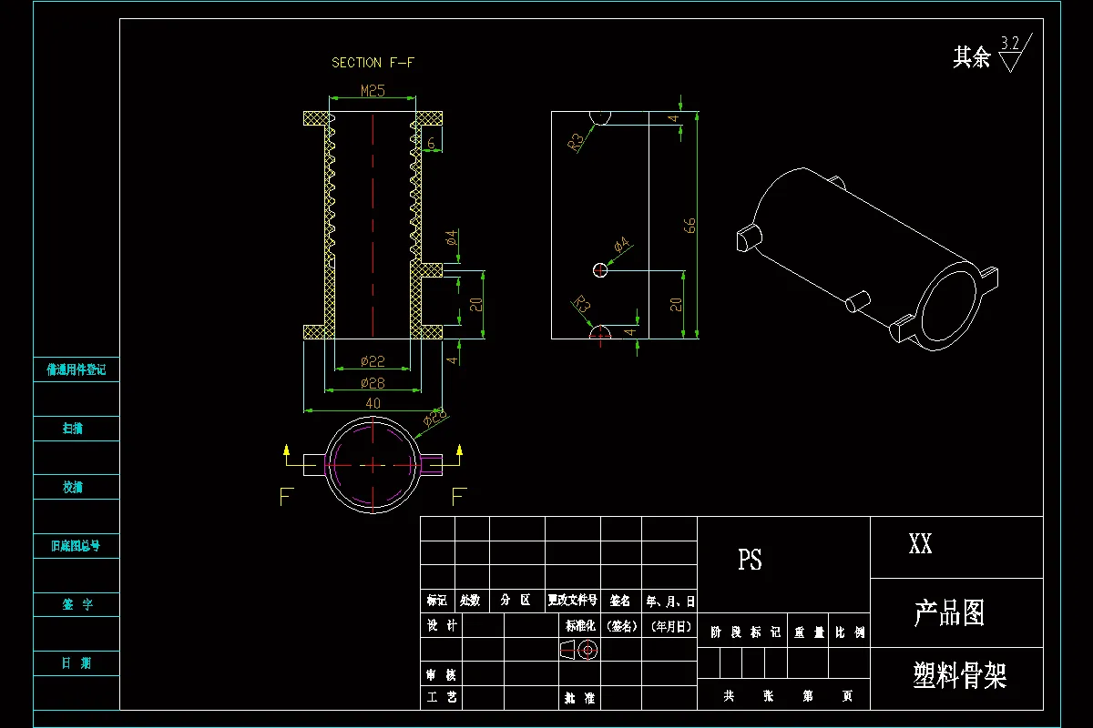 关键词:骨架;一模四腔;点浇口;滑块抽芯;注射机;冷却系统;注塑模具