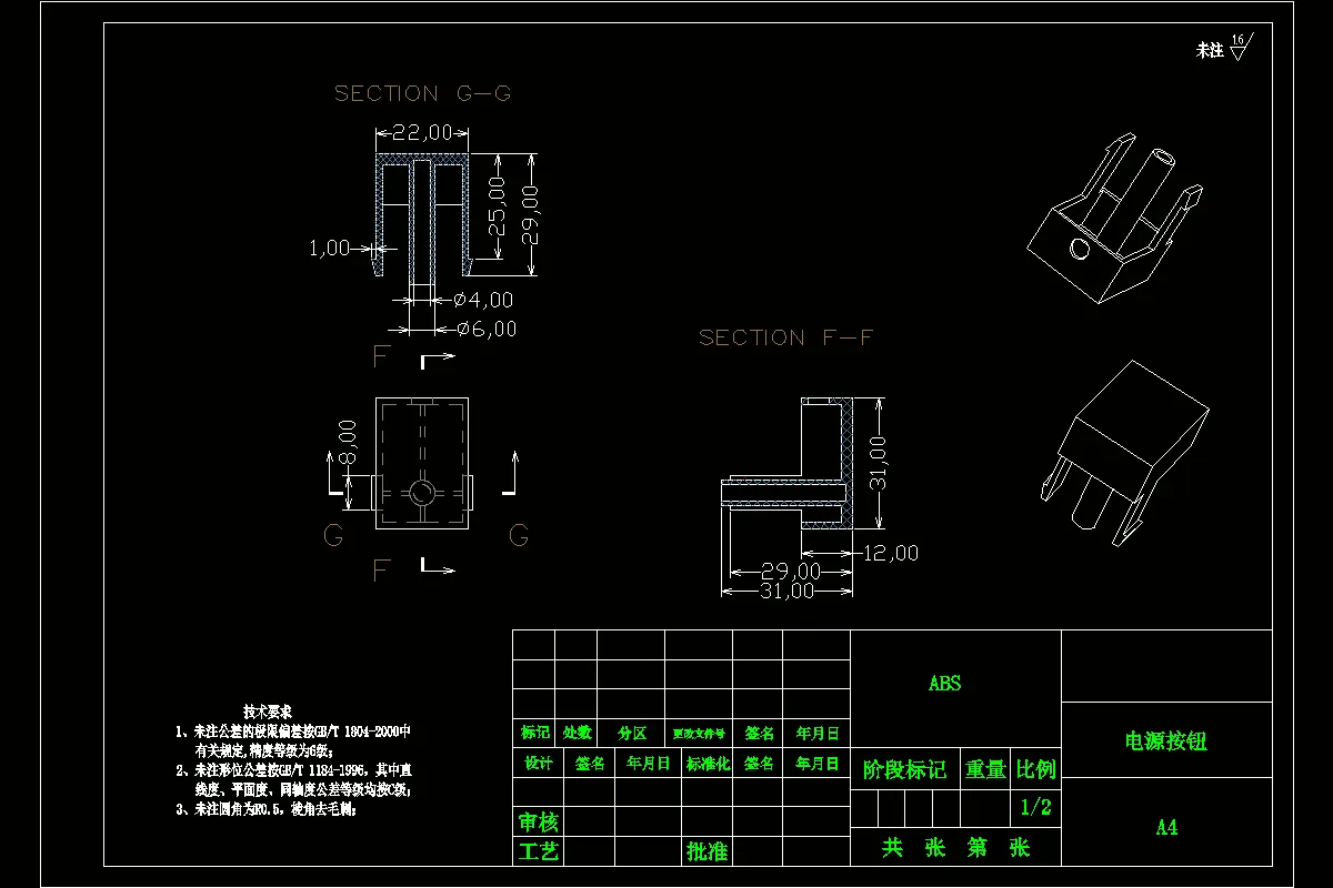 关键词:电源按钮;一模两腔;潜浇口;冷却系统;注塑模具