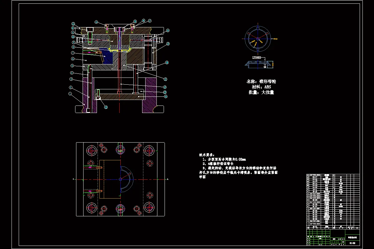 模具工业是国民经济的基础工业,被称为“工业之母”。而塑料模具又是整个模具行业中的一枝独秀,发展极为迅速。塑料制件之所以能够在工业生产中得到广泛应用,是由于它们本身具有的一系列特殊优点所决定的。人类社会的进步与材料的使用密切相关。人类要生存,要发展就离不开材料的使用。塑料是20世纪才发展起来的一类材料。塑料是一种可塑性的合成高分子材料,具有重量轻且坚固,耐化学腐蚀,电绝缘性好,价格便宜,可塑性好等特点,广泛应用于电脑、手机、汽车、电机、电器、家电和通讯产品制造中。注塑成形是成形塑件的主要方法之一,是指使用注塑机将热塑性塑料熔体在高压下注入到模具内经冷却固化获得产品的方法。注塑的优点是生产速度快,效率高,操作可自动化,能成型形状复杂的零件,特别适合大量生产。本次设计的产品为锥形带轮,具有重量轻,强度高,耐腐蚀等特点,为大批量生产产品。本次设计在针对产品进行工艺性分析后,确定模具分型面、型腔数目、浇口形式、位置大小;其中最重要的是确定型芯和型腔的结构,以及它们的定位和紧固方式。此外还进行了脱模机构的设计,合模导向机构的设计,冷却系统的设计等。最后绘制完整的模具装配总图和主要的模具零件图及编制成型零部件的制造加工工艺过程卡片。实践证明:该模具结构合理、可靠,并能保证产品质量,对此类注塑产品的模具设计有参考价值。
