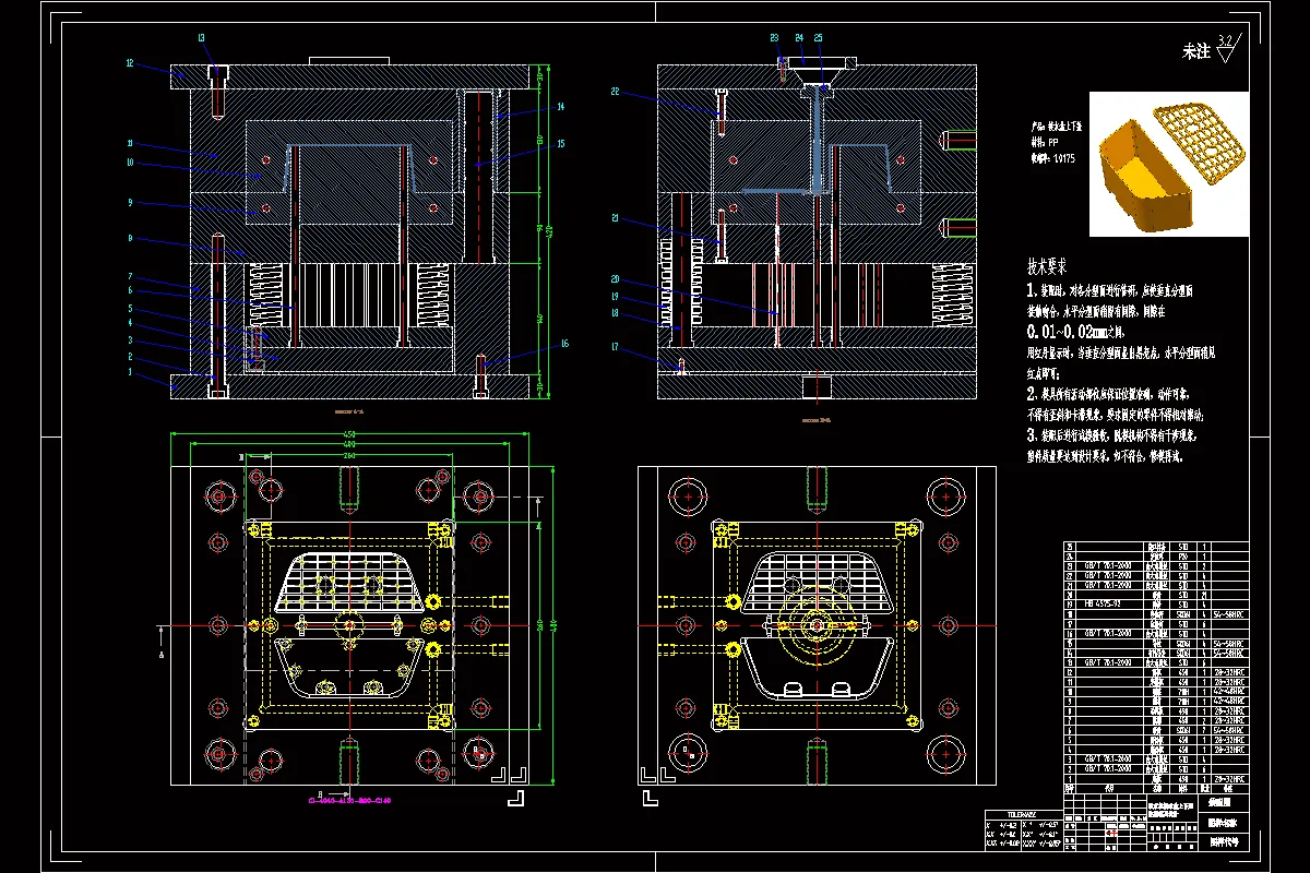 [摘要]本设计主要是针对饮水机接水盒的注塑模具设计,该饮水机接水盒材料为聚丙烯(PP),是工业生产中常见的一种盘类产品。通过对塑件进行工艺的分析和比较,最终设计出一副注塑模。该设计从产品结构工艺性,具体模具结构出发,对模具的浇注系统、模具成型部分的结构、推出机构、冷却系统、注塑机的选择及有关参数的校核都有详细的设计。为保证塑件表面质量采用侧浇口。模具的型腔选择一模两腔结构,浇注系统采用侧浇口成型,推出形式为直接推杆推出机构完成塑件的推出。塑件的工艺性能要求注塑模中有冷却系统,因此在模具设计中也进行了设计。