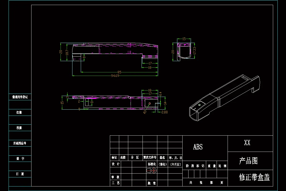 本设计的模具设计对象为修正带盒盖,塑料制品有很多种成型的方法,本设计使用的是最常使用的注塑方式——注射成型,进行修正带盒盖注塑模模具设计。