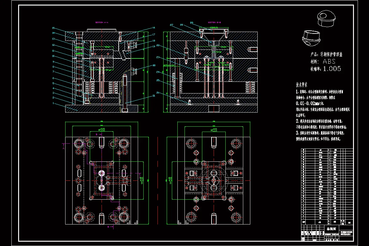 关键词:牙刷保护管顶盖;一模两腔;注射模具,浇注系统,模架,冷却系统